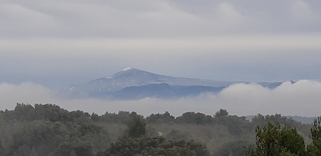 Et c'est vrai, il fallait bien ça pour se parer du temps humide de cet après-midi. Nous sommes donc montés puis descendus puis remontés puis redescendus pour enfin remonter et là, nous étions au bout du bout, au dessus du château de Mornas ! Nous avons fait la pause goûter et découvert le mont Ventoux au dessus des nuages ! Un vrai régal pour les yeux !