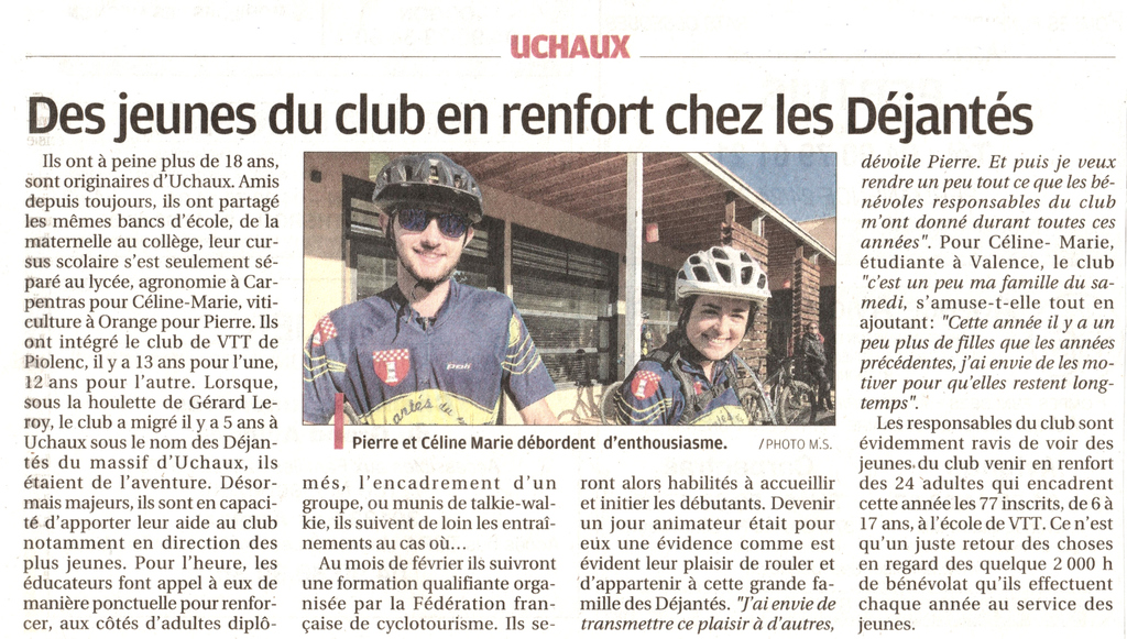 Céline-Marie et Pierre font du VTT depuis... quelques années, et passés leurs 18 ans ils ont décidé de continuer à l'école VTT d'Uchaux, maintenant comme encadrants. Déjà la saison dernière Guillaume, Nicolas et Lucas avaient pris le même chemin ! La moyenne d'âge évolue dans le bon sens ! Un grand merci à tous ces jeunes qui s'engagent dans la vie associative et le font avec beaucoup de sérieux !