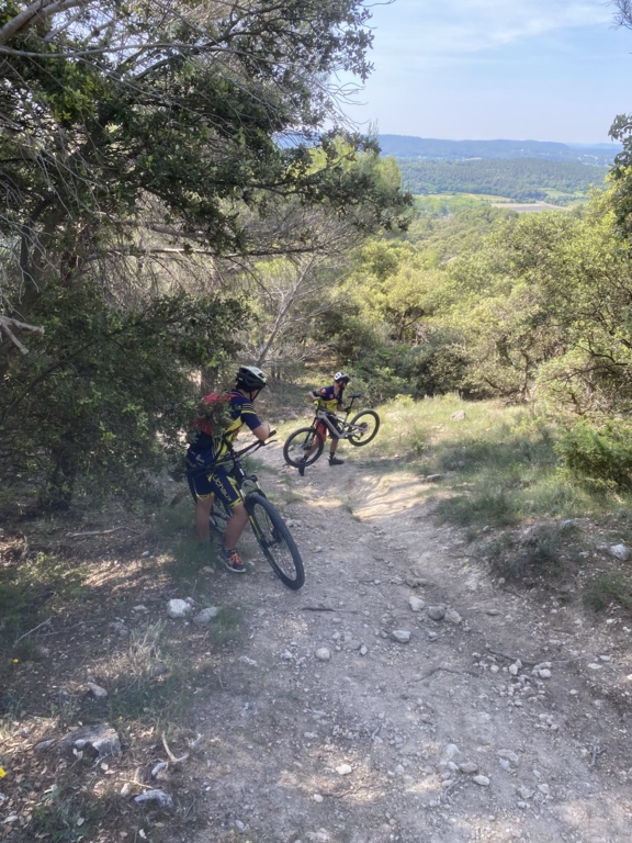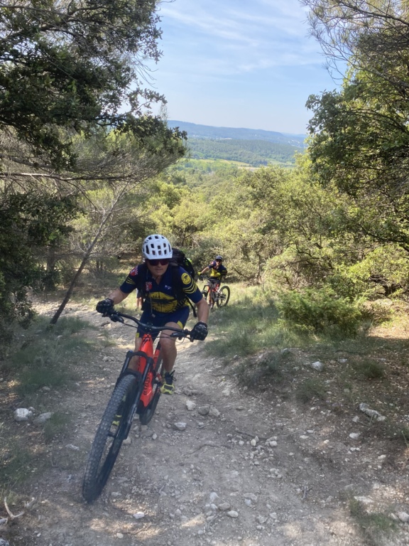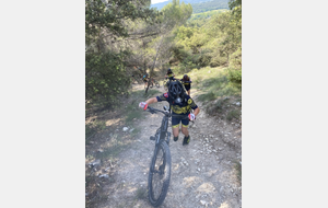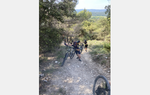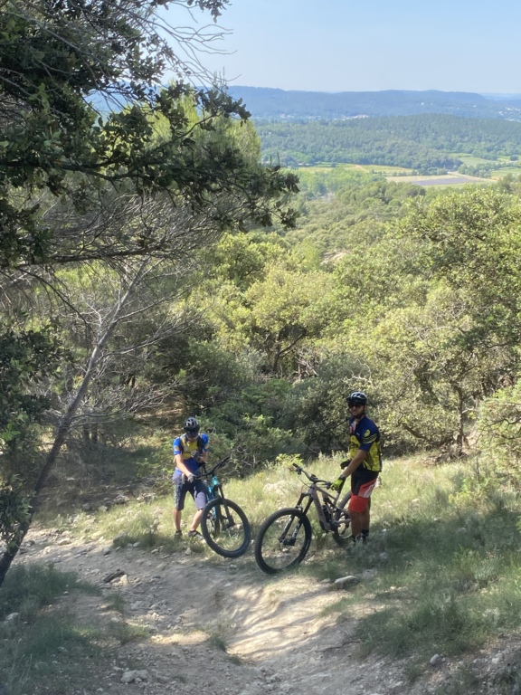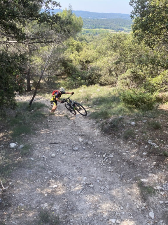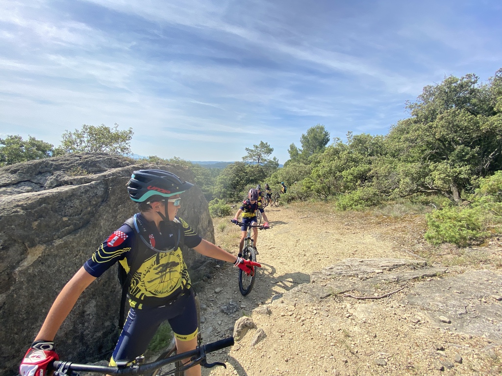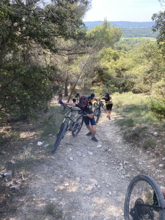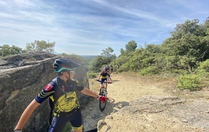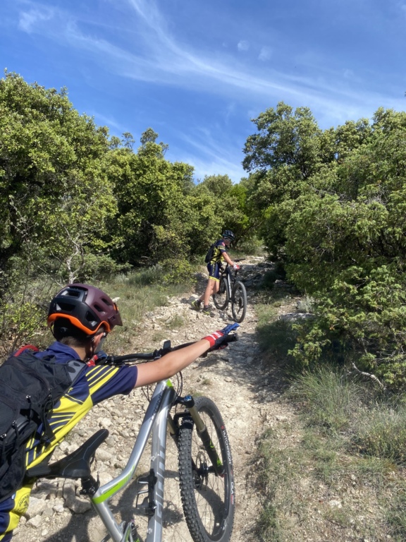 Nous voila enfin partis pour de vrai, une première partie de Bollène vers Saint Restitut, avec une alternance de singles joueurs,  de murs casse pattes, de descentes techniques, de longues montées et de portages… mais du bonheur… tout cela avec en toile de fond, le soleil,  les dentelles et le Ventoux, avec la bonne odeur des genets et de la garrigue.