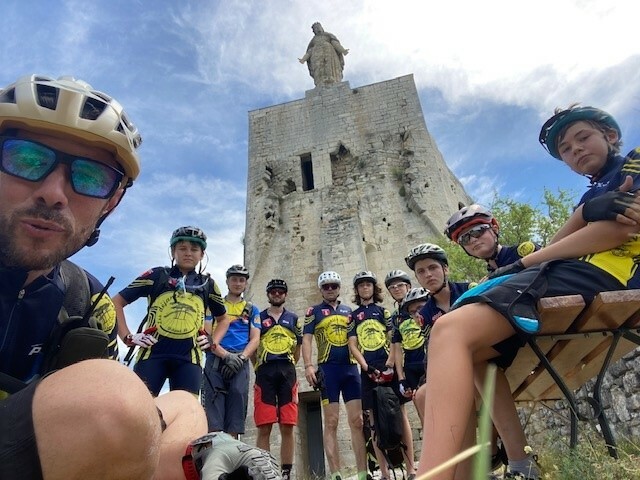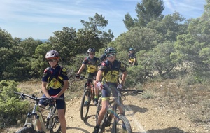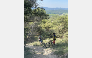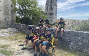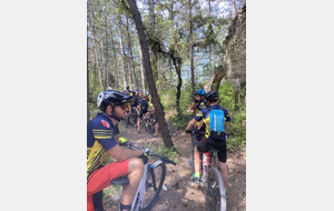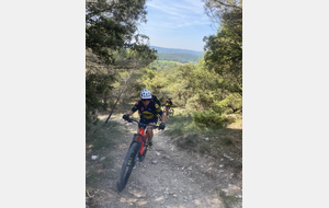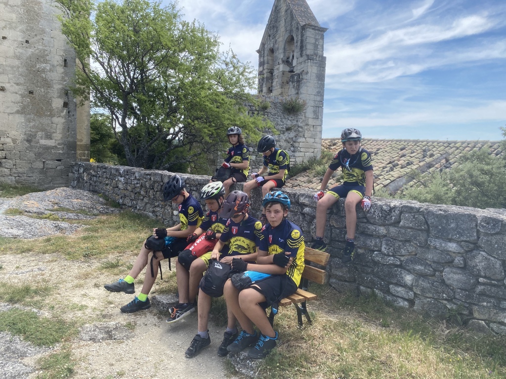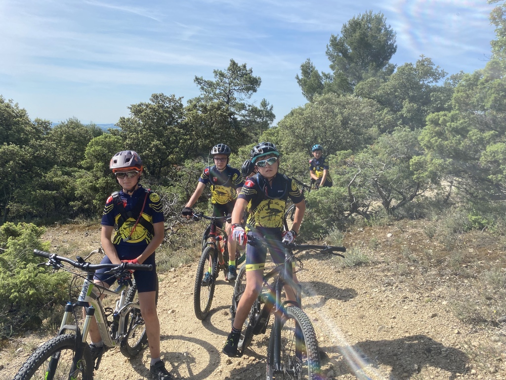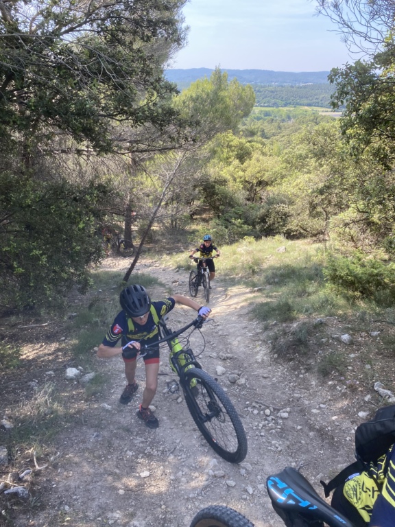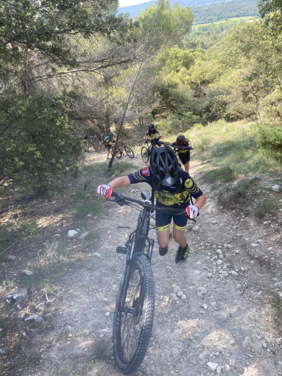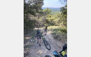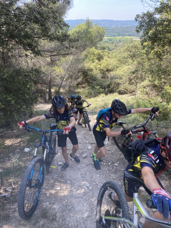 Nous voila enfin partis pour de vrai, une première partie de Bollène vers Saint Restitut, avec une alternance de singles joueurs,  de murs casse pattes, de descentes techniques, de longues montées et de portages… mais du bonheur… tout cela avec en toile de fond, le soleil,  les dentelles et le Ventoux, avec la bonne odeur des genets et de la garrigue.