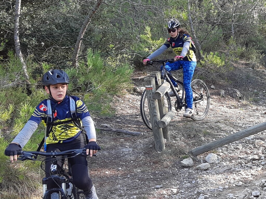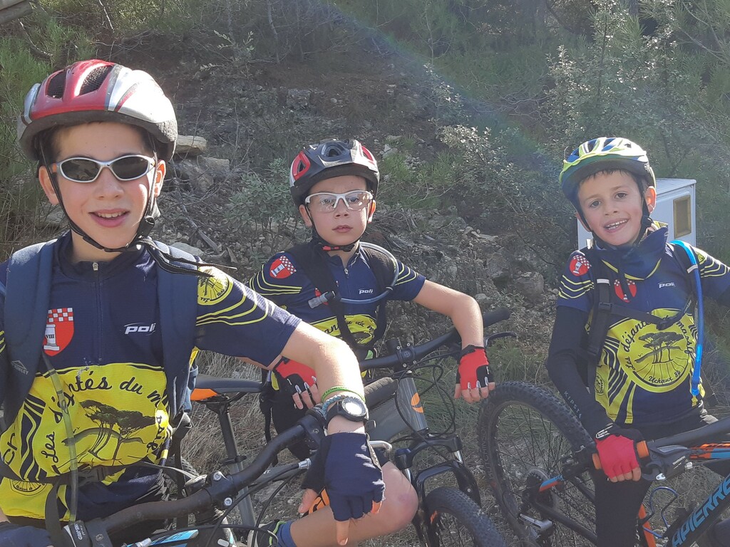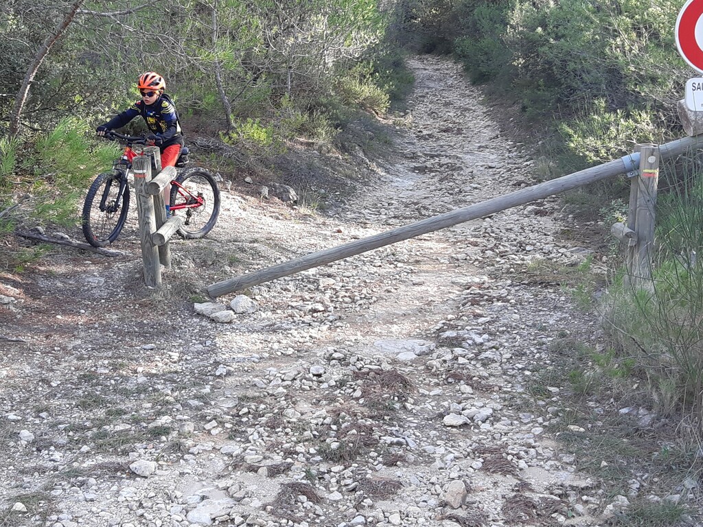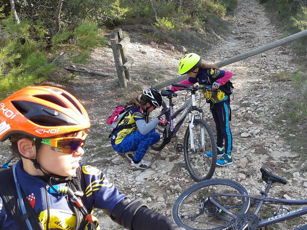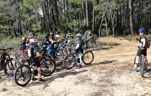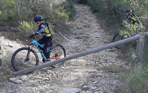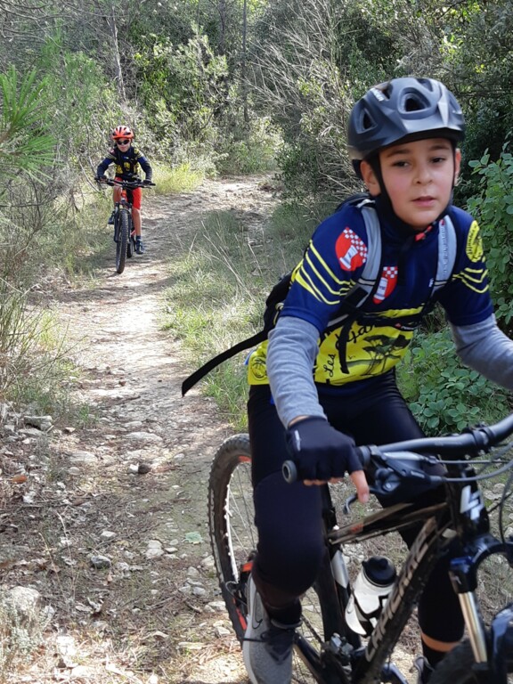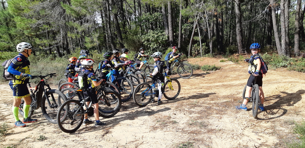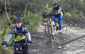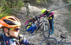 A l'arrivée au bike park, le groupe était très impatient d'attaquer les circuits, mais sécurité oblige, nous avons commencé par un repérage à pied de la piste verte et bleu histoire de canaliser un peu tout le monde. Ensuite, le groupe a enchaîné une piste verte puis une piste bleu à tour de rôle jusqu'à épuisement ! En fait, il a fallu stopper le groupe qui aurait bien tourné des heures ! Mais bon, il faut aussi laisser la place. En plus Fred a prévu un super parcours ! Alors c'est parti pour une descente sous le Castellas ! Nous repartons dans les bois et reprenons le chemin en bas du Castelas, ensuite direction le puit vers St Estève. Nous empruntons pas mal de passages rocailleux et pouvons mettre en pratique les marches vues au bike park ! Mais voilà nous sommes bien descendus... et une belle montée nous attend. Le groupe est prévenu ! Objectif, aller le plus loin possible sans poser le pied à terre. le single en montée comporte des pierres et avec la fatigue, l'exercice n'est pas facile ! Enfin nous arrivons au DFCI et la pause goûter s'est présentée naturellement !