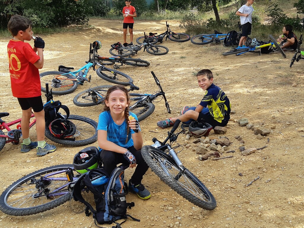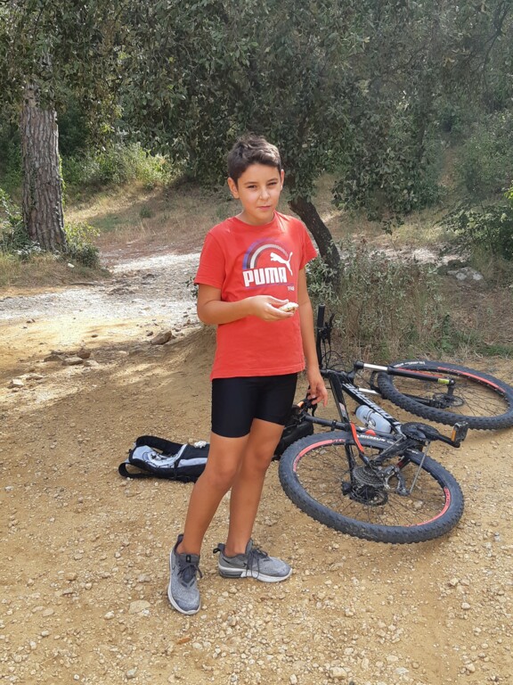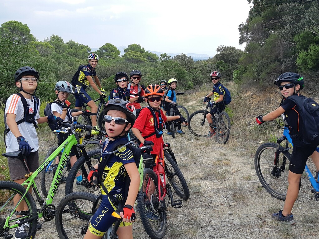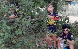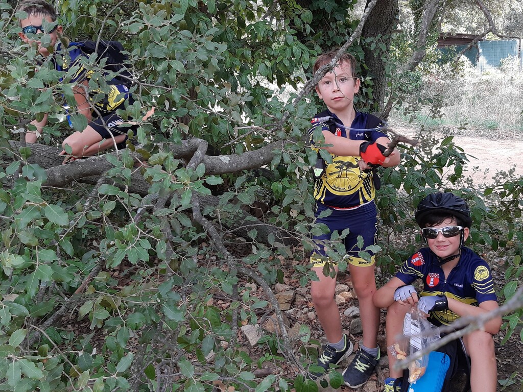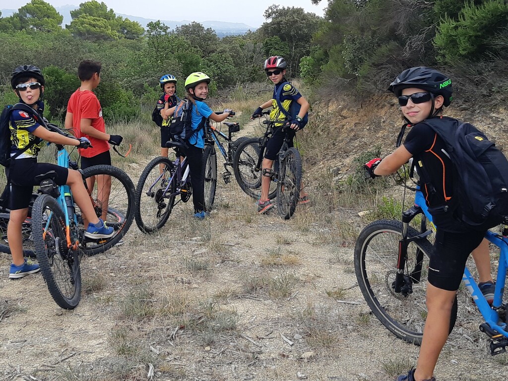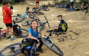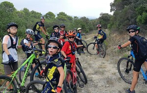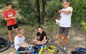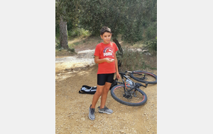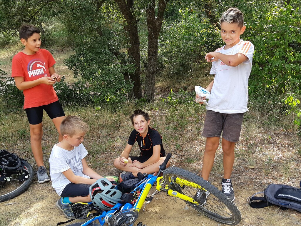 Nous partons ensuite sur les singles exigeants en direction des vignes de st Estève. Les nombreuses racines et cailloux rendent la pratique du VTT très technique et comme ça monte, nous prenons le temps et grimpons jusqu'aux vignes. L'arrivée se fait par une descente assez délicate. Avec Lucas, nous assurons le passage. Le temps passe et nous n'avons pas beaucoup roulé. nous décidons de reprendre en direction de SERIGNAN par un autre single un peu plus haut. Après un passage de sanglier plein de branche, nous retrouvons le circuit et prenons la descente, c'est là que Ewans nous fait une belle figure ! Mais plus de peur que de mal. Nous repartons et poursuivons la descente jusqu'à la placette. Là, nous nous arrêtons pour gouter (voir photos).