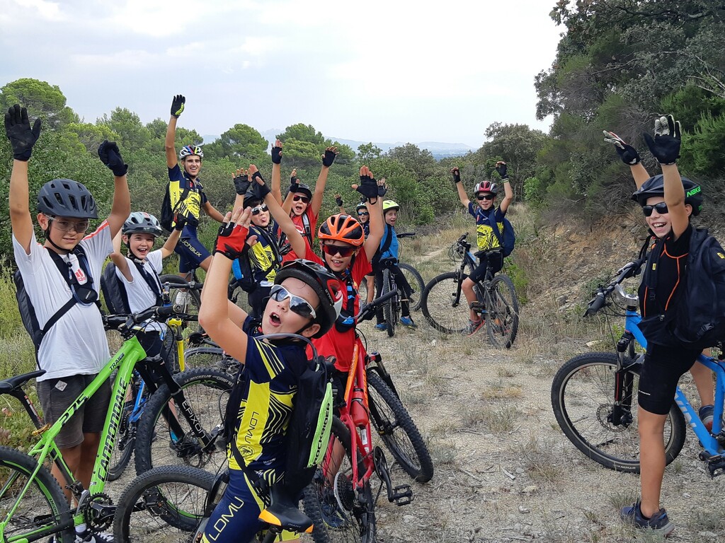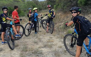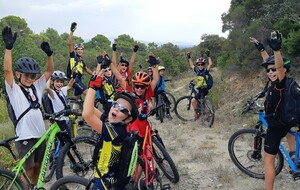 Ensuite, pour rouler un peu plus, nous nous dirigeons vers le DFCI, mais le DFCI, c'est pas assez rigolo alors nous passons à droite et nous nous retrouvons à nouveau dans un beau petit single ! Là, nous nous retrouvons face à un beau défi avec une montée raide de 2 m à passer à vive allure ! Les uns après les autres, le groupe passe, avec un petit coup de main tout de même ! Mais la sensation du franchissement est découverte ! Un peu plus loin une difficulté similaire mais un peu moins forte est à passer et chacun a déjà moins d'appréhension de se lancer. Nous poursuivons notre chemin et grimpons jusqu'au bout du chemin au dessous des lignes électriques. Arrivée en haut, plus moyen d'aller plus loin sans corde d'escalade ! Donc demi tour ! Petite photo et c'est parti pour la descente.