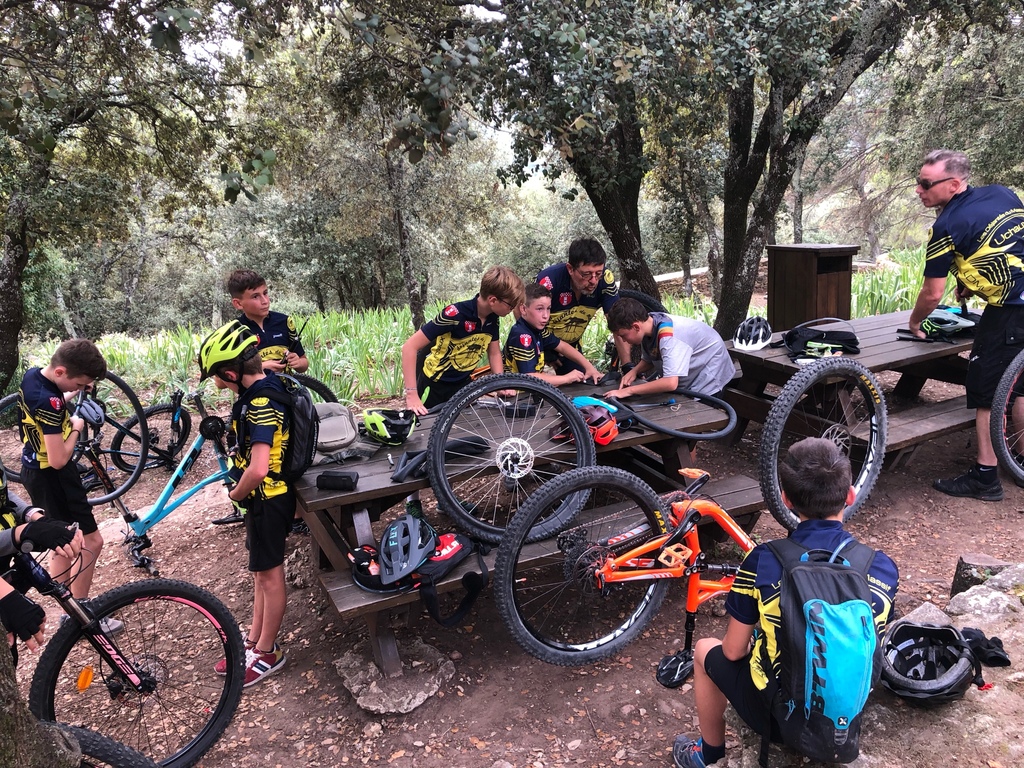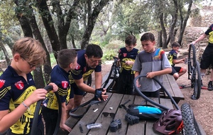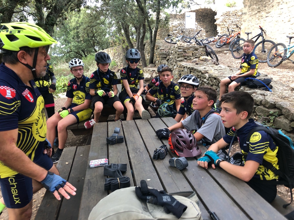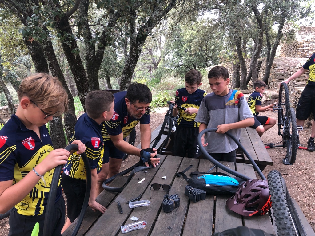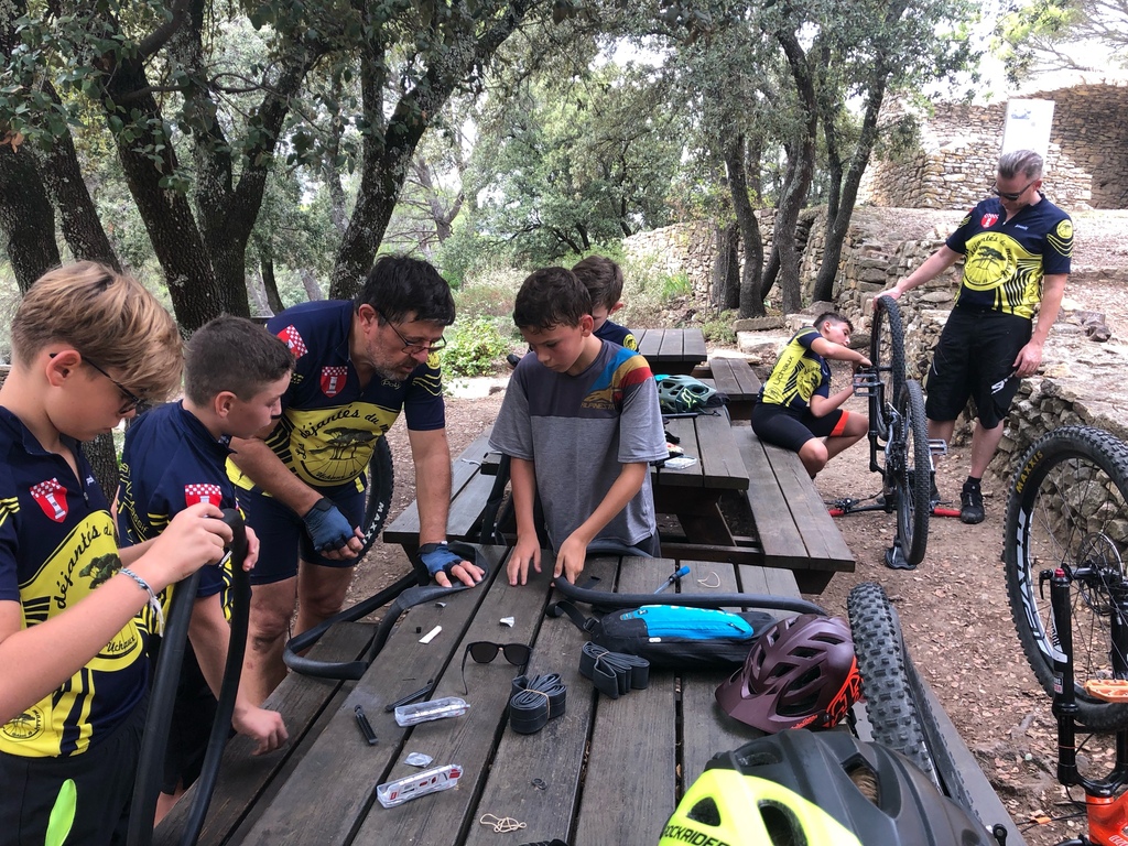 Partis des Farjons et après une petite boucle "tambour battant" nous nous retrouvions à la chapelle du Castellas pour un entrainement à la réparation de chambre à air... tout le monde s'est prêté au jeu (mais avaient ils le choix ?) et tous ont réussi à réparer les crevaisons préparées par Gérard et Loïc 🔪 ...