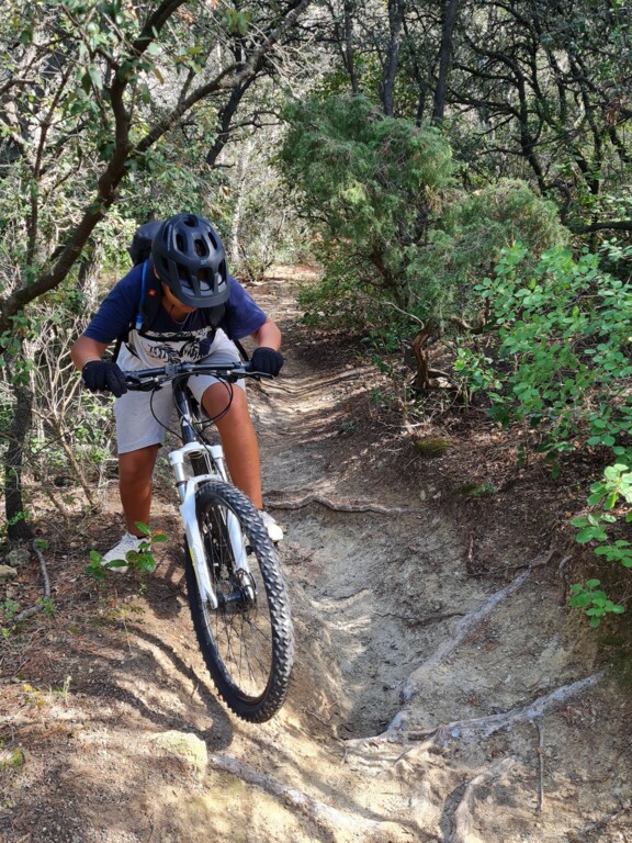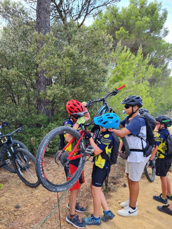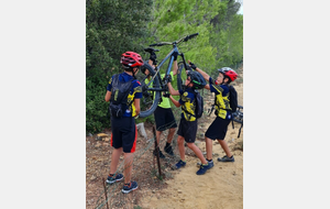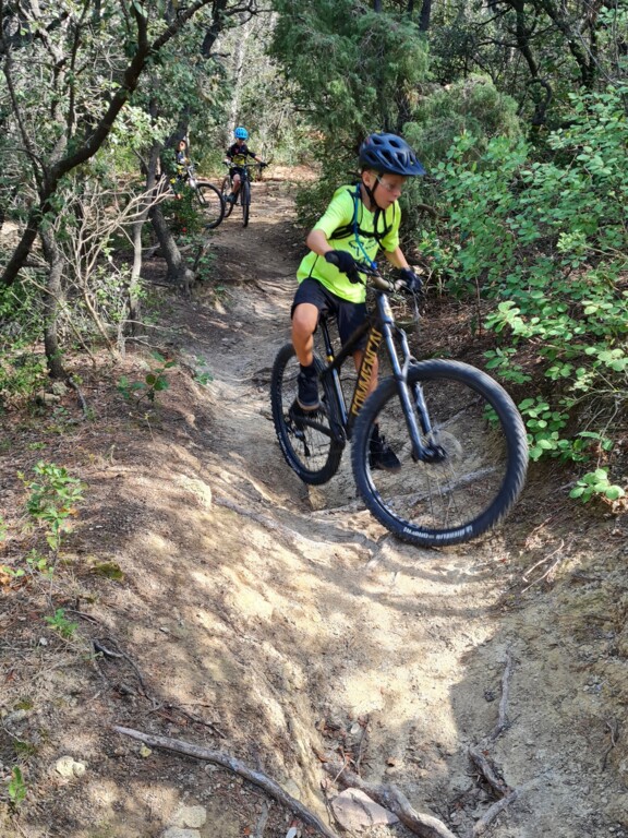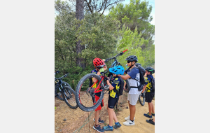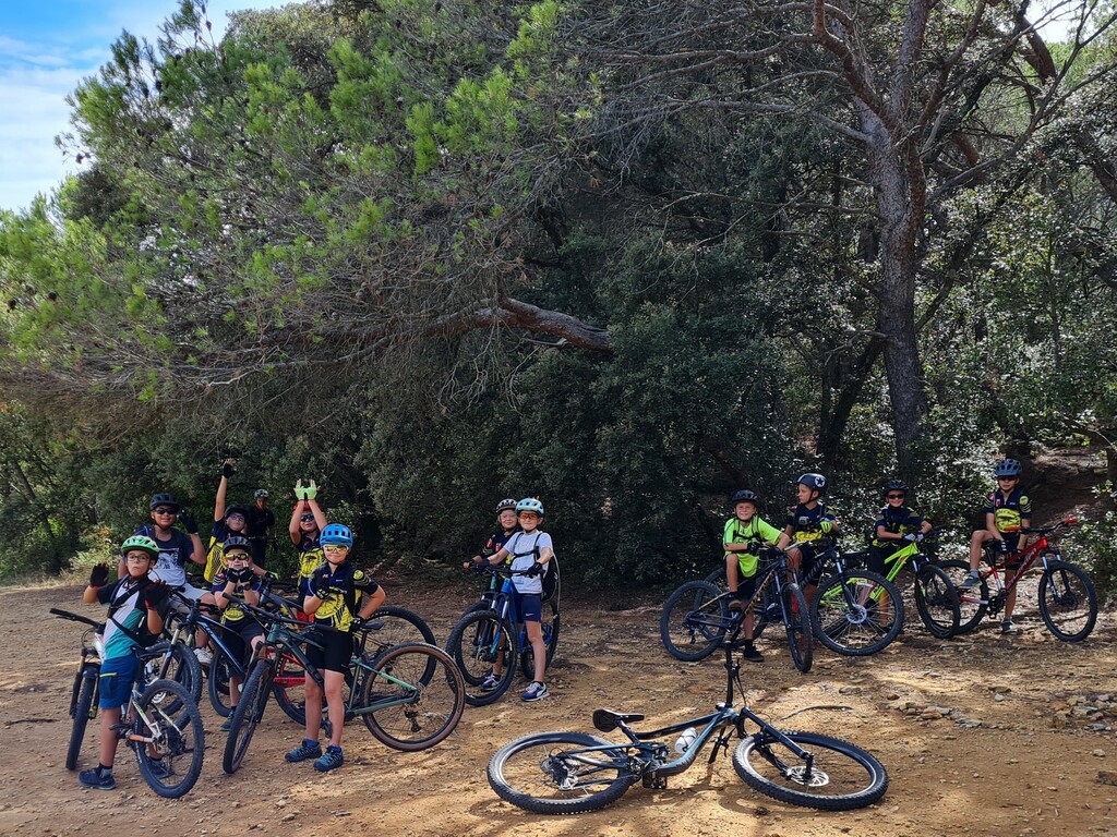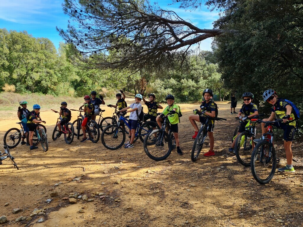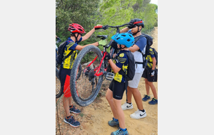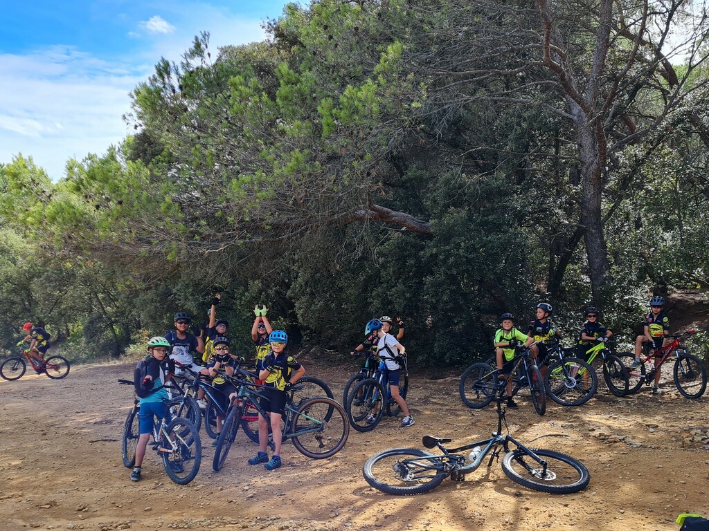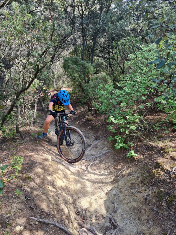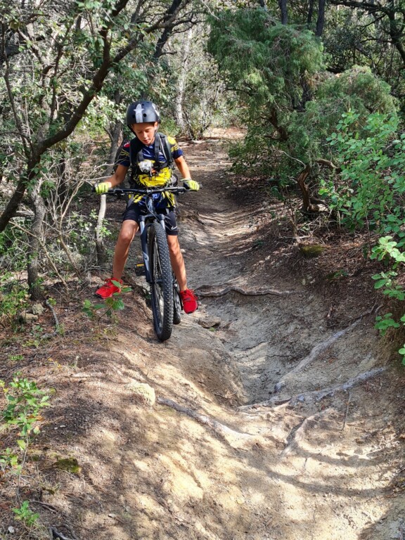 Notre retour, guidé par Marco, nous fait suivre de jolis passages avec une vue magnifique sur la plaine. Nous longeons ensuite les vignes et revenons sur nos premiers tours de roues pour rejoindre le Castellas. Là nous retrouvons les parents pour partager une collation et un goûter bien mérité. Merci à Fred pour les préparatifs !