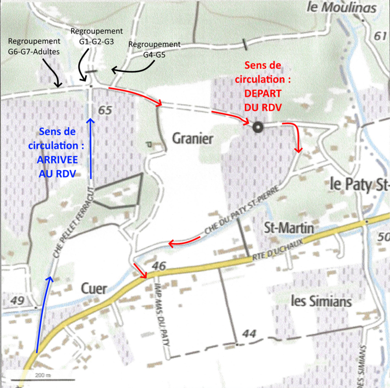 Afin de permettre une circulation plus fluide, et d'éviter que tous les groupes soient réunis en un même point, un essai sera fait ce samedi. Voir le plan ci dessous :