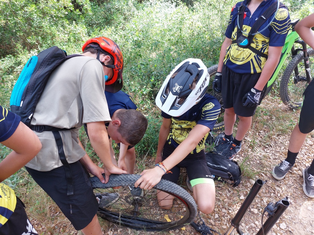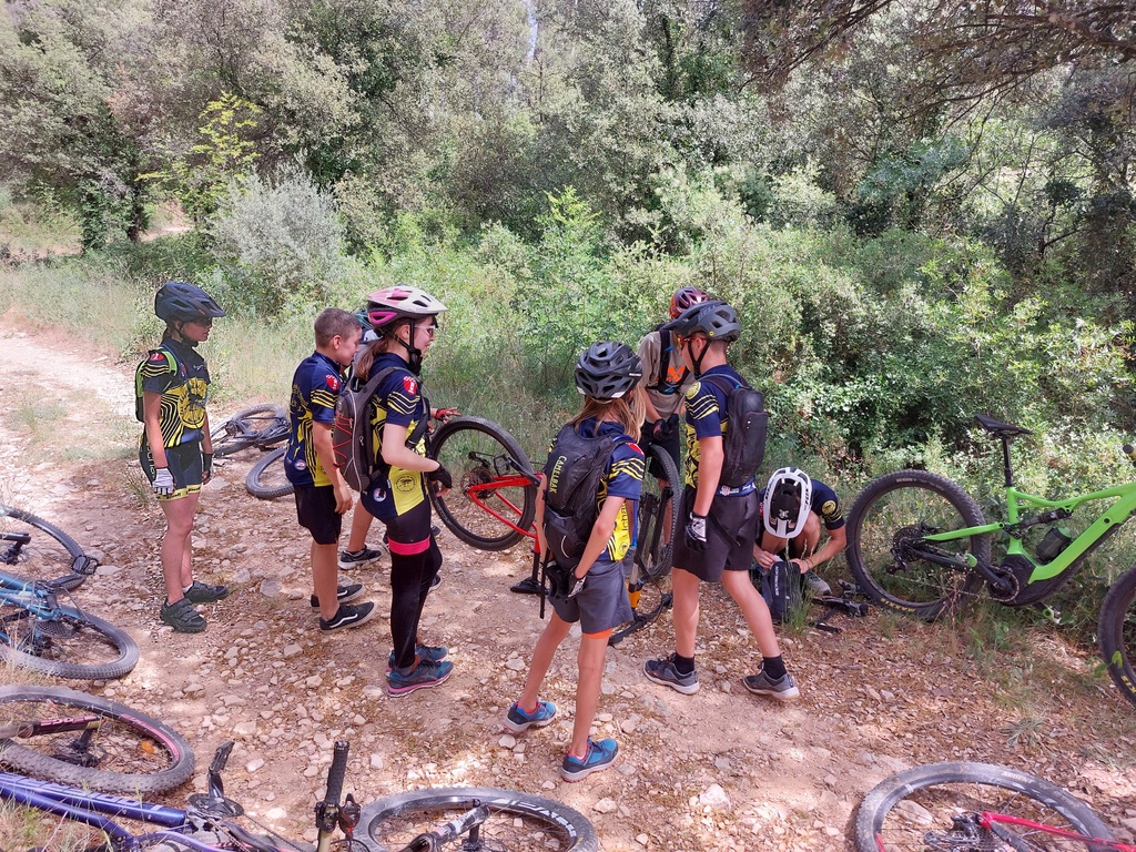 Prenez 1/3 de "groupe 4", 2/3 de "groupe 5", une moitié d'encadrants expérimentés et une moitié de plus jeunes, ajoutez y un zeste de jeunesse... c'était la composition de notre groupe cet après-midi, avec, au programme la boucle commune plus la boucle 1 de notre dernière randonnée. Nous avons un peu arrangé ça à notre sauce, avec comme résultats 19 km et 400 m de d+ environ ! Et ceci malgré le vent (si, si, il y avait du vent !) et 3 crevaisons... Bravo à toutes et à tous pour votre volonté et votre persévérance !