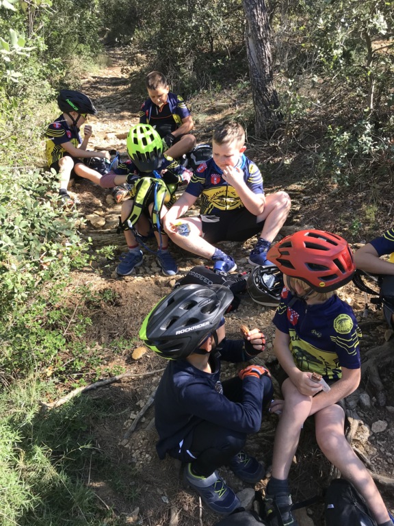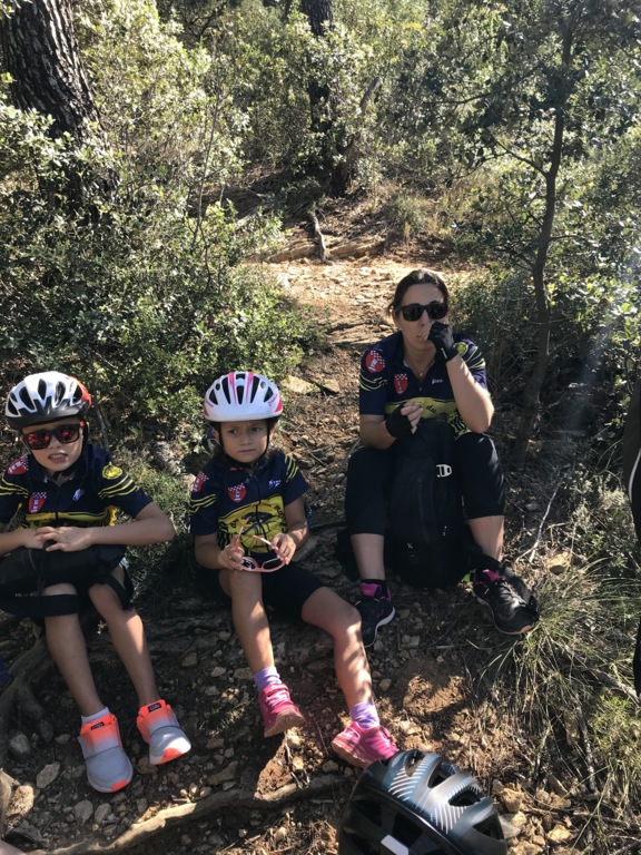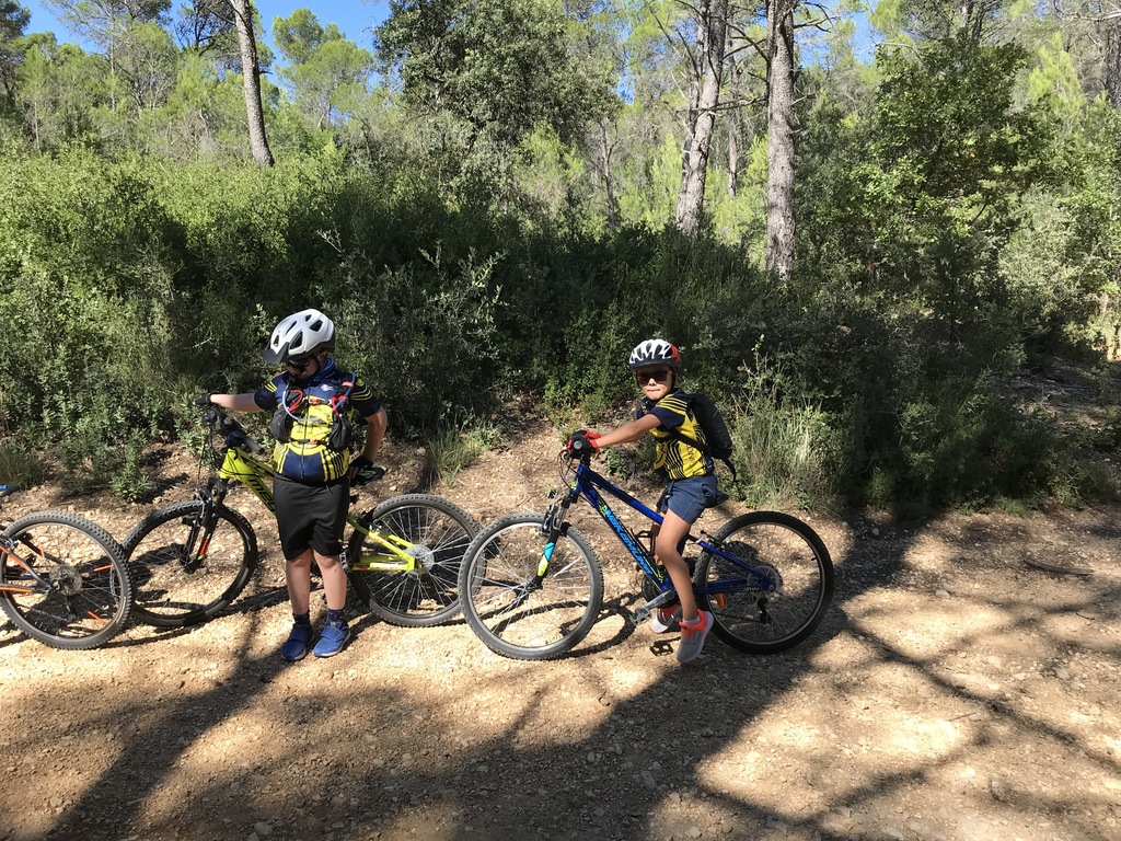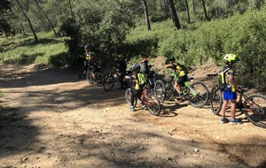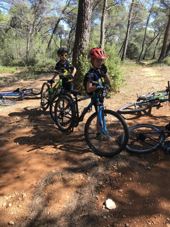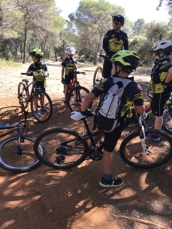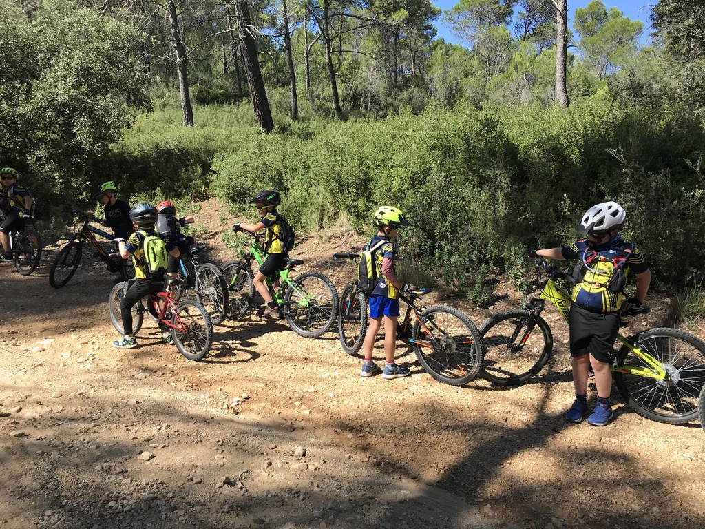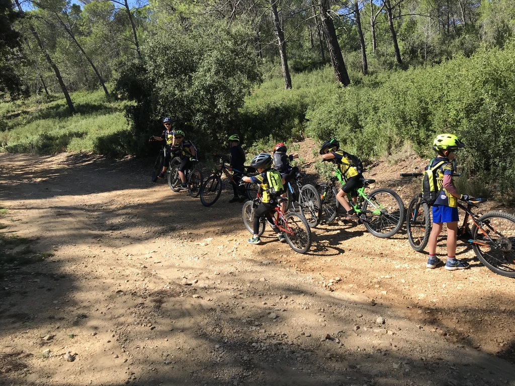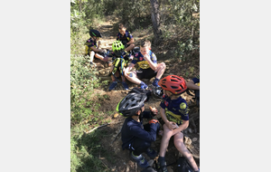 Départ du Paty à Piolenc ce samedi 17 spetembre. Il y avait beaucoup de vent. Après un échauffement autour des tables pour améliorer la position en descente, nous sommes montés par le DFCI en haut de la colline pour redescendre sous les bois par des singles sympas jusqu'au parking du départ.
